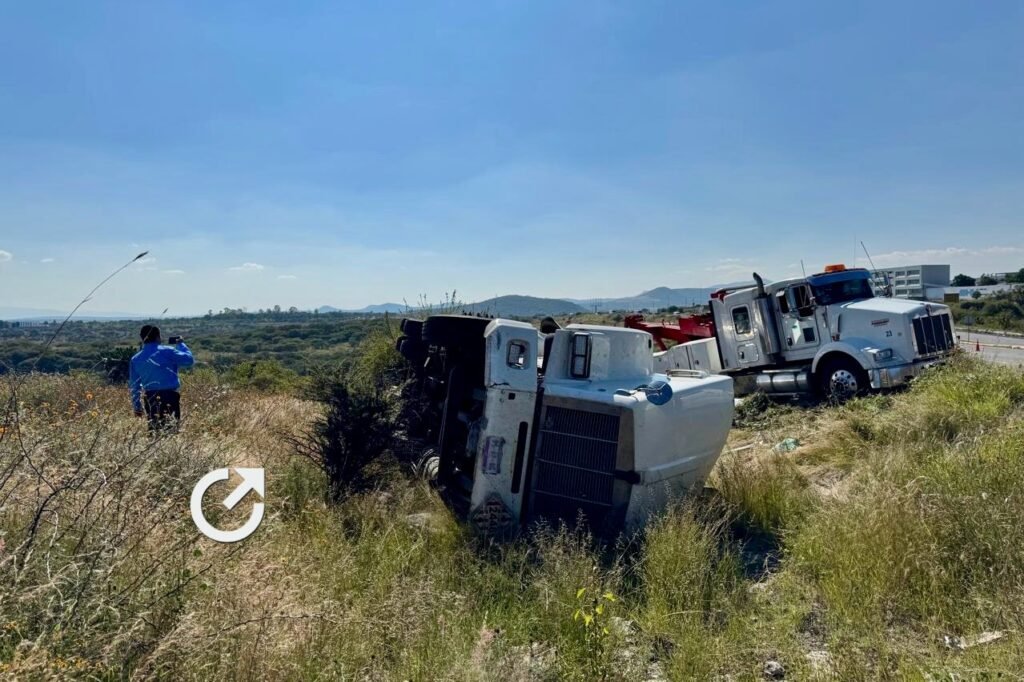 El chofer de un tráiler, quien presuntamente manejaba a exceso de velocidad, volcó con su unidad que transportaba azufre a la altura del kilómetro 35.5 del Libramiento Norponiente de Querétaro, dirección Santa Rosa Jáuregui, la tarde de este martes 14 de octubre.