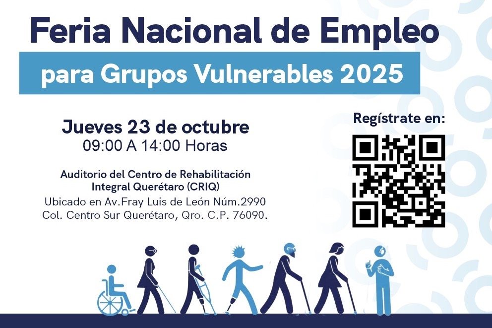 La Secretaría del Trabajo del Estado de Querétaro, en coordinación con el Sistema Estatal DIF (SEDIF), invita a participar en la Feria Nacional de Empleo para Grupos Vulnerables 2025, que se llevará a cabo el jueves 23 de octubre, de 9:00 a 14:00 horas, en el Centro de Rehabilitación Integral de Querétaro (CRIQ).