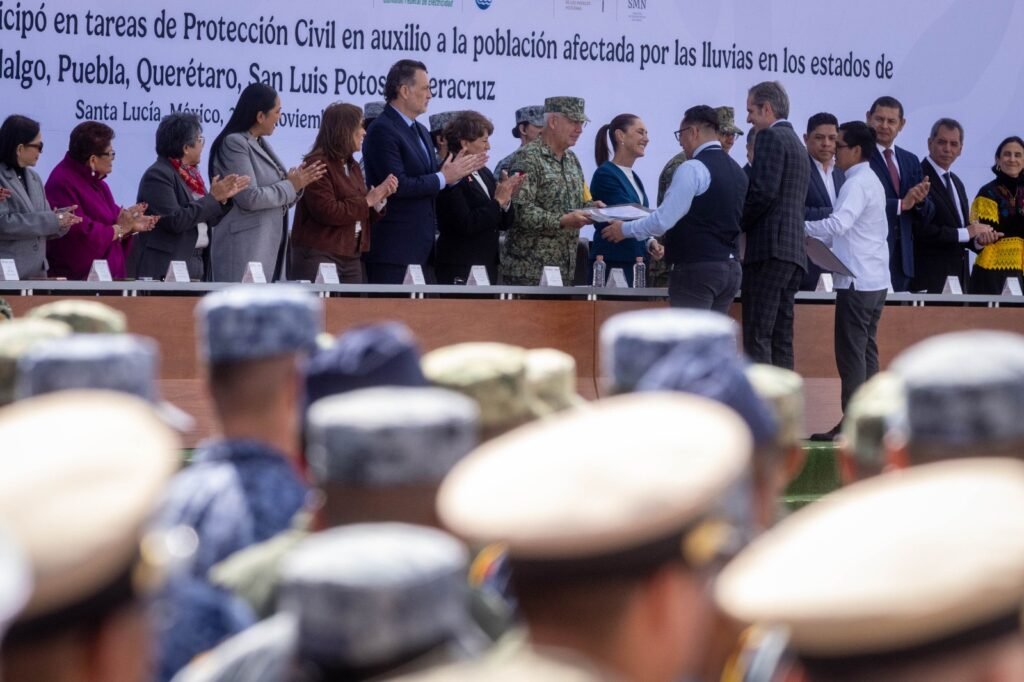 El gobernador Mauricio Kuri González acompañó a la presidenta de México, Claudia Sheinbaum Pardo, en la ceremonia de Reconocimiento al Personal que Participó en Tareas de Protección Civil a través de los planes DN-III-E y Marina, así como de la Comisión Federal de Electricidad (CFE), derivado de la contingencia por las lluvias en los estados de Querétaro, Veracruz, Puebla, San Luis Potosí e Hidalgo.
