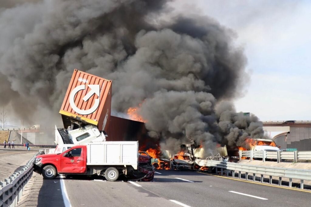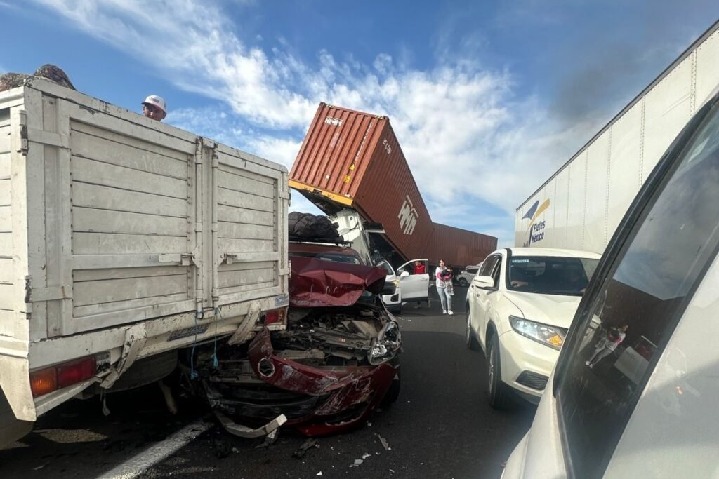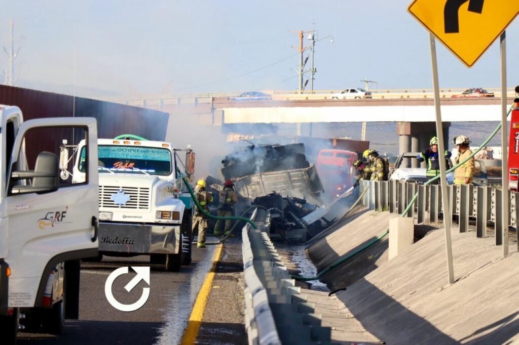 Un accidente involucró a 11 vehículos, dos de ellos unidades de carga, en el kilómetro 28 de la Carretera Federal 57, en las inmediaciones del Parque Industrial Querétaro, dirección Santa Rosa Jáuregui; aunque el percance fue aparatoso y se calcinaron varios automóviles, las autoridades descartaron víctimas fatales.
