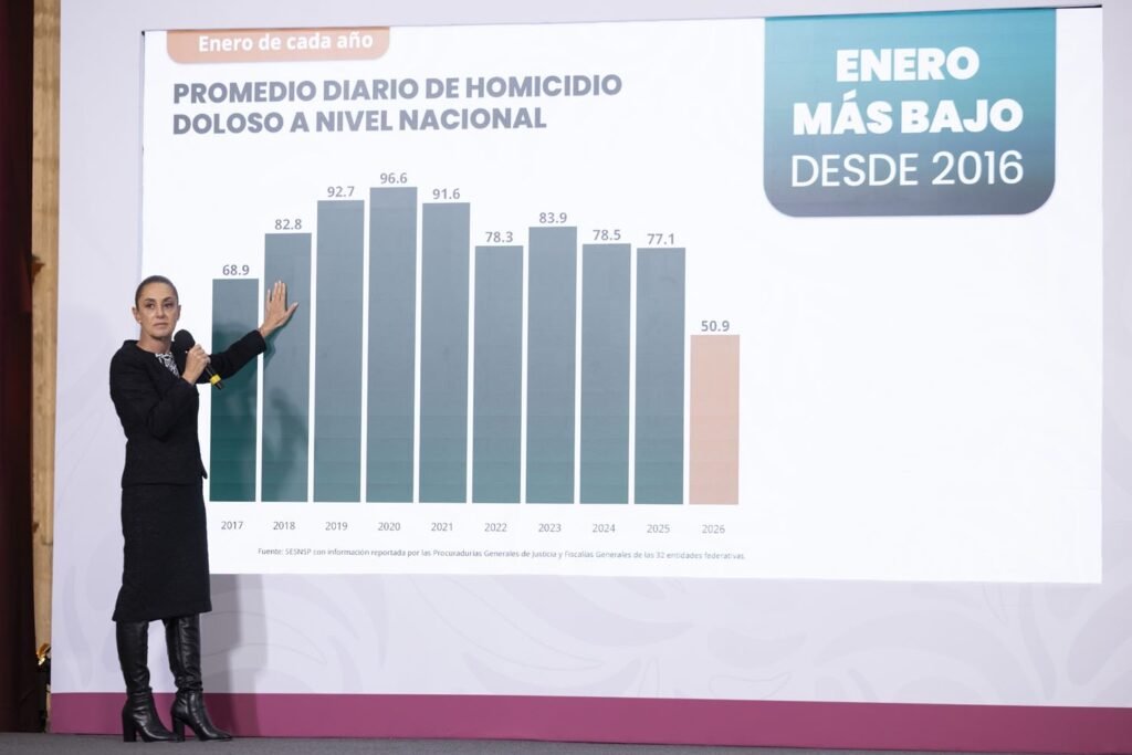 La presidenta Claudia Sheinbaum Pardo informó la baja de 42 por ciento en homicidio doloso entre septiembre 2024 y enero 2026, lo que significa que hoy se cometen 36 de estos delitos menos al día en México.