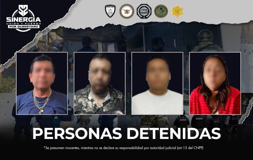 Una mujer y tres hombres fueron detenidos por presuntos delitos contra la salud, lo anterior durante tres cateos simultáneos en la capital en el marco de la estrategia Sinergia por Querétaro, informó la Fiscalía General del Estado.