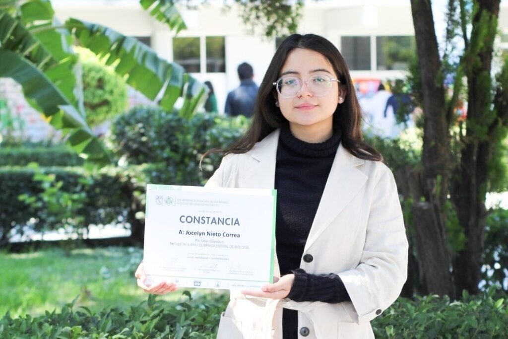 La queretana Jocelyn Nieto Correa, de sexto semestre de la Escuela de Bachilleres de la Universidad Autónoma de Querétaro (UAQ), plantel San Juan del Río, obtuvo el primer lugar en la Olimpiada Estatal de Biología realizada en el campus Juriquilla, consolidándose como una de las promesas con mayor desempeño académico en esta disciplina.
