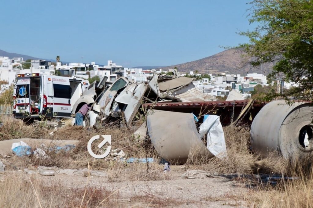 El conductor de un tráiler, acoplado con plataforma y que transportaba un rollo de metal, tuvo una aparatosa volcadura a la altura del kilómetro 41.3 del Libramiento Norponiente de Querétaro, dirección Celaya, en inmediaciones de Preserve Juriquilla, Santa Rosa Jáuregui, por lo que resultó con algunos golpes y contusiones.