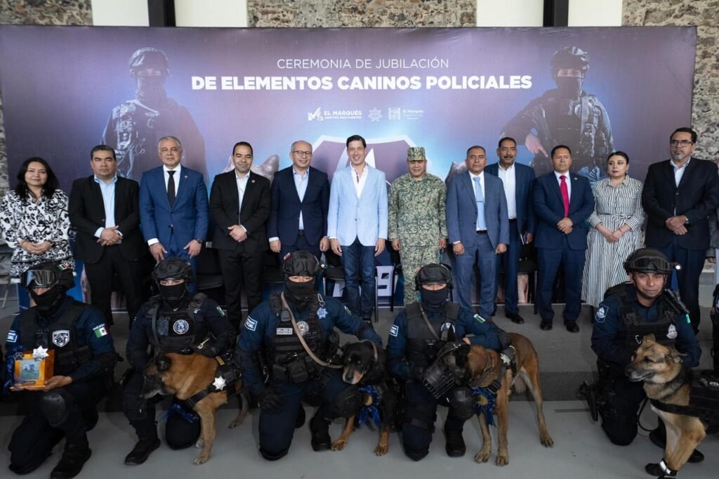 En un acto solemne, el presidente municipal de El Marqués, Rodrigo Monsalvo Castelán, encabezó la ceremonia de jubilación de tres elementos caninos policiales y el homenaje póstumo a un cuarto ejemplar, los cuales formaron parte de la Unidad K9 de la Secretaría de Seguridad Pública Municipal (SSPM).