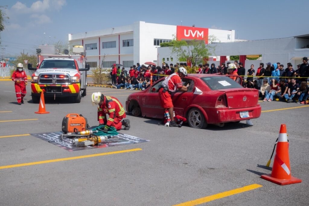 Para promover la prevención de accidentes viales y la protección de la vida de las y los jóvenes mediante acciones de sensibilización y educación, se realizó la simulación de un percance ocasionado por el consumo de alcohol, actividad presentada por la Cruz Roja Mexicana, Delegación Querétaro, ante estudiantes de preparatoria de la Universidad del Valle de México (UVM).