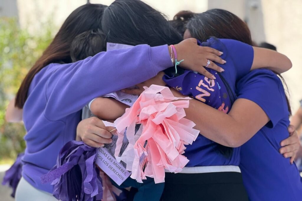 Durante la actividad, las mujeres y sus hijas e hijos recorrieron distintos espacios del refugio portando carteles, pañuelos y símbolos en color morado, elaborados por ellas mismas, con mensajes de esperanza, libertad y rechazo a la violencia.