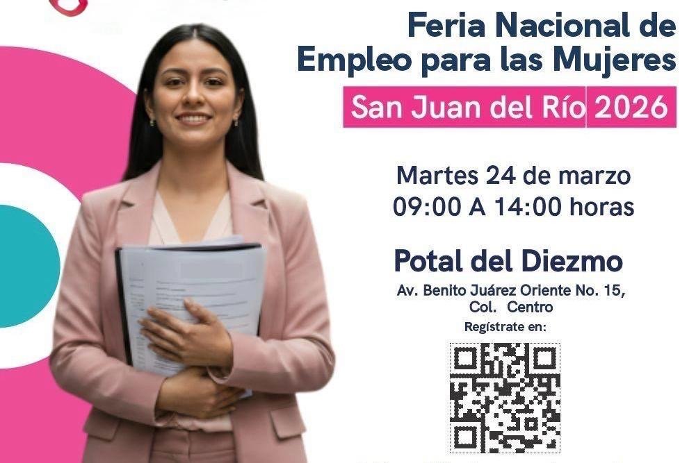 La Secretaría del Trabajo (ST) invita a la Feria Nacional de Empleo para las Mujeres 2026, en la primera edición que se llevará a cabo en el municipio de San Juan del Río, el próximo martes 24 de marzo, de 09:00 a 14:00 horas, en el Portal del Diezmo.