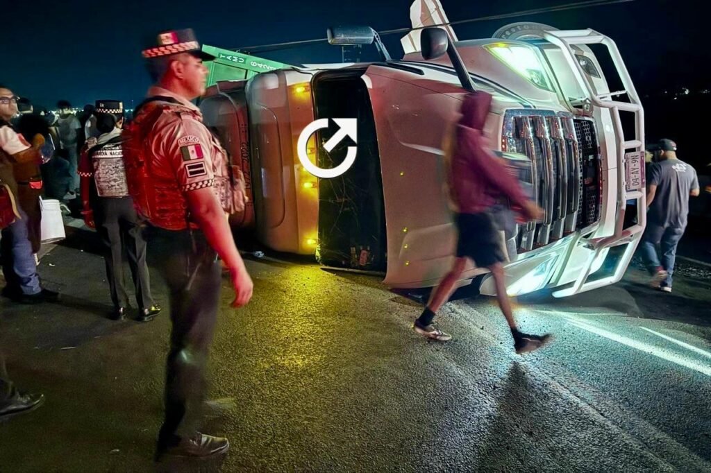 El percance ocurrió alrededor de las 17:30 horas del martes 7 de abril, cuando presuntamente el chofer de la unidad de carga manejaba a exceso de velocidad, por lo que al tomar la curva perdió el control del volante y el vehículo quedó volcado sobre su lado derecho, dañando además un tramo de la barra metálica de contención.