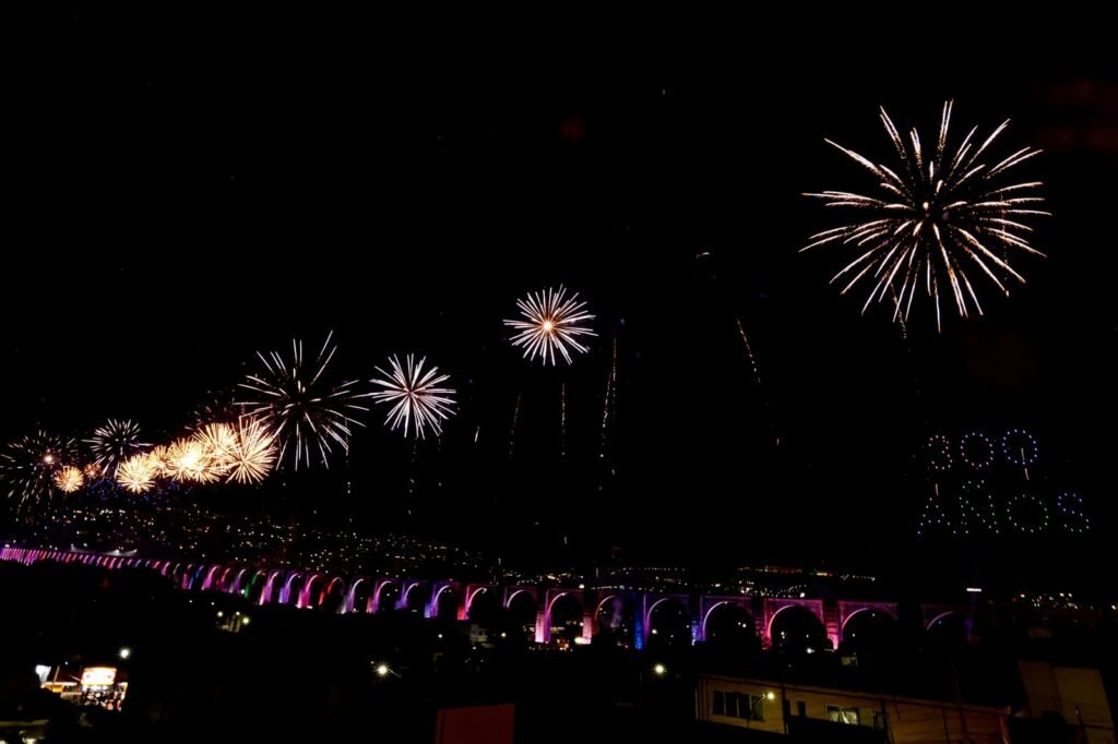 El alcalde realizó un recorrido a través de los cinco escenarios instalados por toda la Calzada de los Arcos como: Folklor y Tradiciones, Dj’s, Querétaro Tierra de Compositores y Cantantes, Del Rock al Danzón y finalmente, en el escenario principal, donde presenció junto con las y los queretanos el espectáculo de luces, sonido y drones, en el cual se lograron apreciar diferentes figuras en el momento cumbre de la velada.