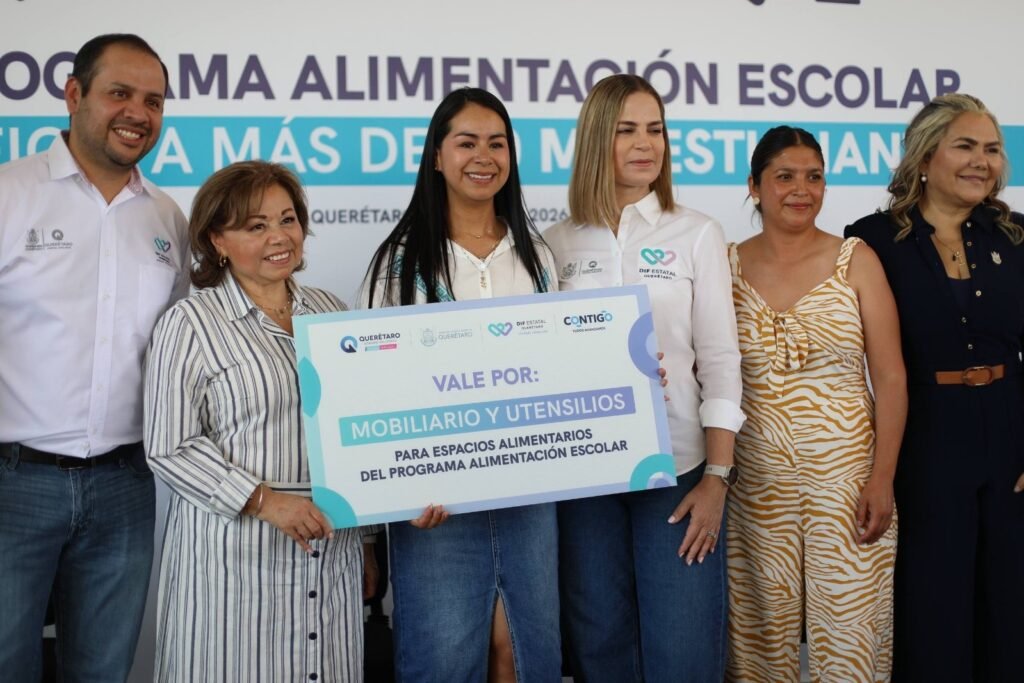 Durante un evento realizado en la comunidad de Pintillo, Santa Rosa Jáuregui, la presidenta del Patronato del Sistema Estatal DIF, Car Herrera de Kuri, entregó en una segunda etapa mobiliario y utensilios para espacios alimentarios del Programa de Alimentación Escolar 2026, que beneficia a los municipios de Colón, Corregidora, El Marqués, Huimilpan, Pedro Escobedo y Querétaro.