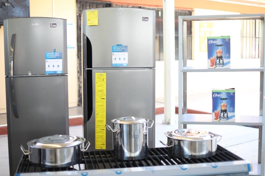 Cabe señalar que los comités de madres de familia de las primarias y secundarias beneficiadas recibieron ollas, estufones a gas, anaqueles, budineras, charolas, comales, chucharas, cuchillos, mesa de lavado, mesa de trabajo, sartenes, tazones, vasos, platos, botes para basura, botiquín de primeros auxilios y se hizo especial énfasis en la entrega de licuadoras y refrigeradores, necesarios para garantizar la conservación e inocuidad de los alimentos.